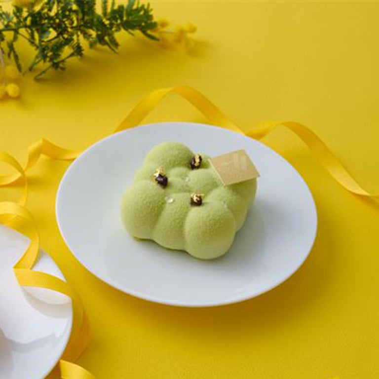 テ・ヴェール 翠茶の意。長崎彼杵茶のムースで、大納言・求肥・コニャックをあしらったガナッシュ、アーモンド生地の層を包み込みました。