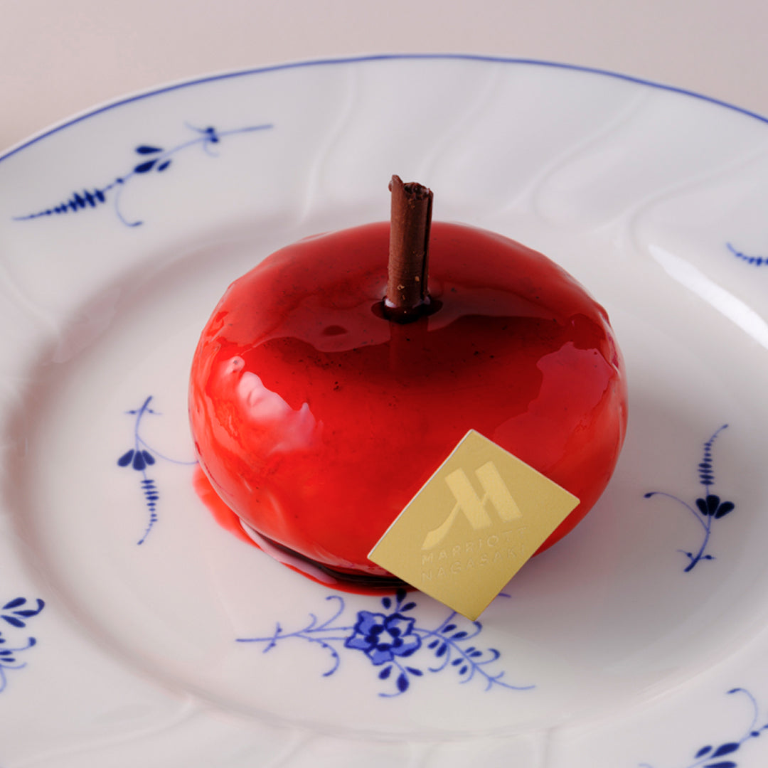 ヘーゼルナッツのムースの中にラム酒の香るクリームとチョコレートを纏わせたサクサクのフレーク、リンゴのキャラメリゼを中に詰めている。底の生地は紅茶のダックワーズ。りんごをイメージした形に仕上げています。